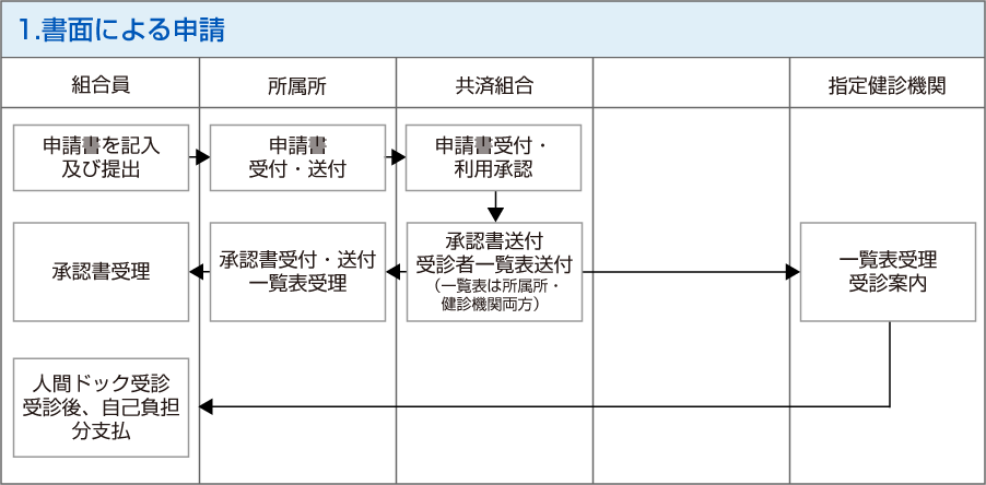 - 健診日予約後、所属所の共済事務担当課から「人間ドック利用承認申請書」を受け取るか、または共済組合HPからダウンロードし、必要事項を記入のうえ所属所経由にて、必ず健診日の1か月前(31日前)までに共済組合へ提出してください。